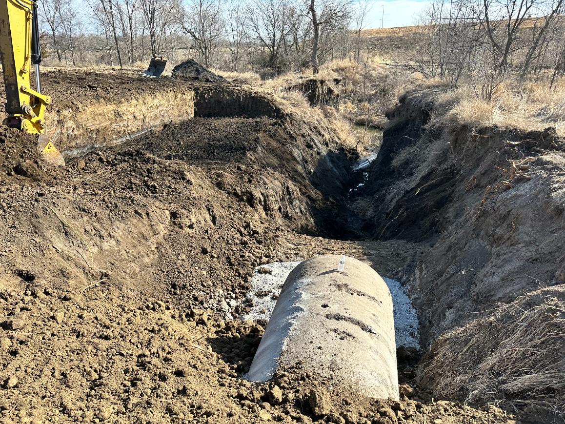 In 2023 Thompson Construction took on a Storm Sewer repair in Papillion, NE. The task was to repair and replace an old 48” concrete pipe storm sewer line. Over the years with erosion the pipe became exposed and washed out. The job included surveying and some in house engineering to not only fix the line but also ensure its longevity. It included clearing brush and trees along with re-grading the area with swales and ditches for better water control.